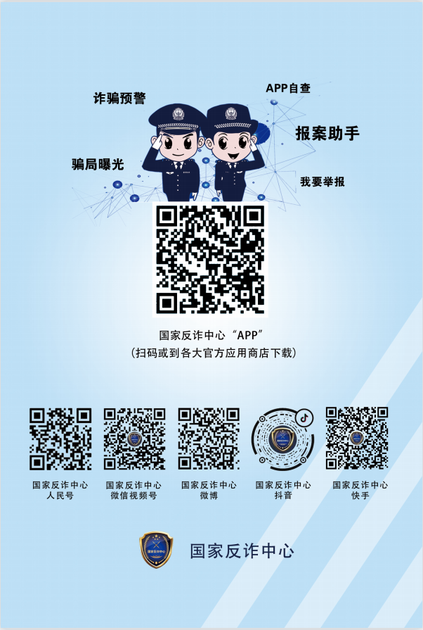 为进一步提高对电信网络诈骗的知晓率和防骗识骗能力,我们倡议各位学生家长下载安装“国家反诈中心”APP,并关注“国家反诈中心”政务号(抖音、微信视频号、微博、快手、人民号)。“国家反诈中心”APP是一款能实时弹窗预警诈骗、快速举报诈骗内容的软件,“国家反诈中心”政务号里有丰富的反电诈短视频、防骗提醒等知识,通过浏览政务号可以有效提高广大用户的知晓率和防骗识骗能力,避免上当受骗,保护好大家的钱袋子。具体安装、关注方法如下: